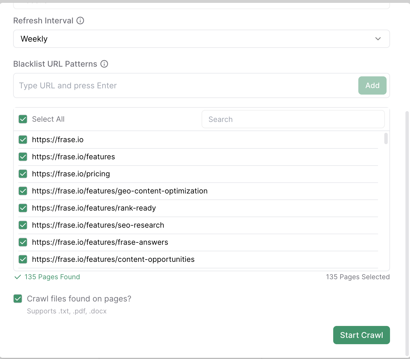 When you start a new crawl, you can decide if PDFs should be part of your chatbot’s knowledge base or left out to keep things more focused.