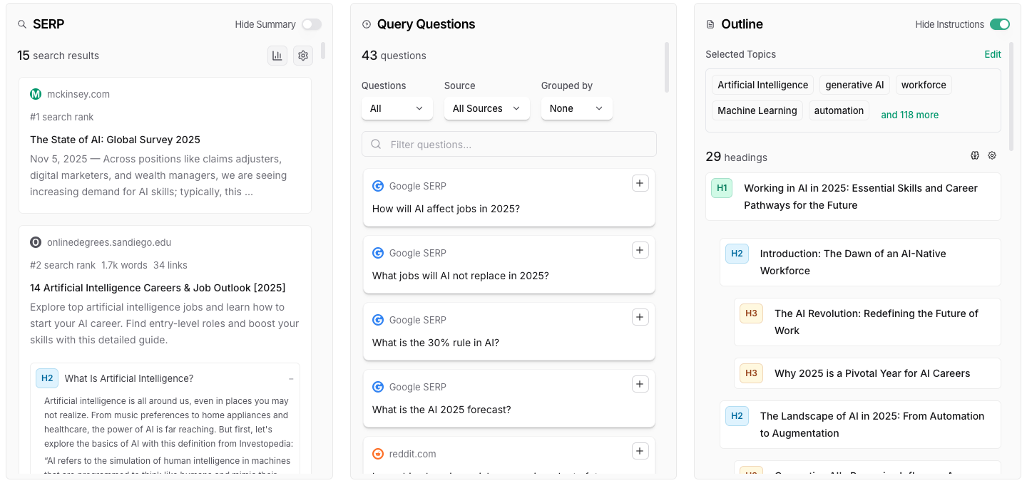 - In the Outline tab, you'll review the AI-generated outline recommendation based on the SERP results, and you can add, remove, and edit the heading structure as needed. This is also where you will decide where your query questions should be placed into the outline