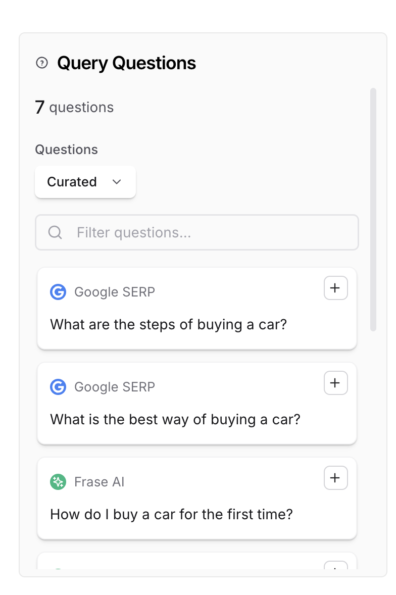 In the Query Questions column, choose any of the questions we've identified that can help with GEO ranking to add to your outline.