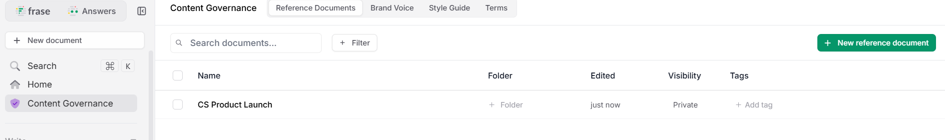 Reference Documents give your team a central place to store important materials that shape content quality and accuracy. Think brand guidelines, product specs, research, internal documentation—you name it. You can find it in the Content Governance tab on the left.