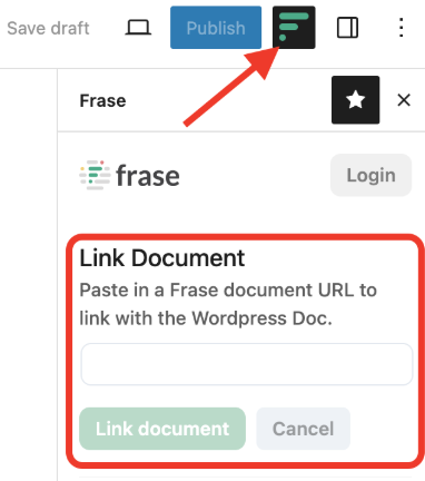 When in a WordPress document, click the Frase logo at the top right, and then paste your Frase document link into the Link Document field and click the button to link it.