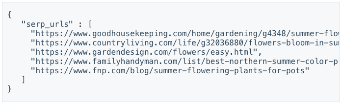 | serp_urls | The list of URLs you want to process. Send as list of strings |