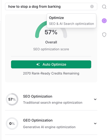 Note: Auto-Optimize uses Rank-Ready Document Credits. Each run consumes one credit. You can see your remaining credits at the bottom of the Optimize panel and purchase more when needed directly from your workspace.