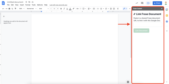 - You'll see a sidebar appear that will prompt you to link to a Frase Document.